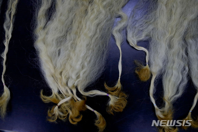 【카라카스=AP/뉴시스】지난 2일(현지시간) 베네수엘라 수도 카라카스의 한 미용실 진열장에 여성들이 판매한 머리카락이 염색된 채 전시돼 있다.