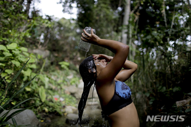 【카라카스=AP/뉴시스】지난 3일(현지시간) 베네수엘라 수도 카라카스의 한 개울에서 바바라 에르난데스가 머리를 감고 있다.
