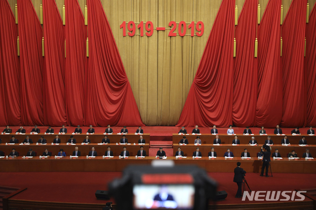 【베이징=AP/뉴시스】 시진핑 중국 국가주석 겸 당 총서기(앞줄 가운데)가 30일 베이징 인민대회당에서 열린 5.4운동 100주년 기념행사에 참석, 기조연설을 통해 공산당의 영도에 따라 애국주의를 발현하자고 촉구하고 있다. 2019.04.30