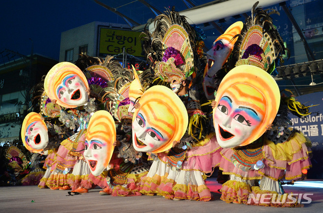 【대구=뉴시스】우종록 기자 = 대구의 대표축제인 2019 대구컬러풀 페스티벌을 하루 앞둔 3일 오후 대구 중구 동성로 야외무대에서 열린 전야제 행사에서 해외 참가팀들이 퍼레이드 퍼포먼스로 축제 분위기를 띄우고 있다. 2019.05.03.