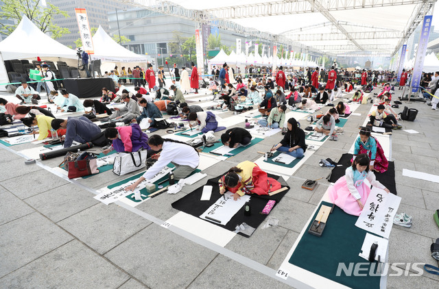 【서울=뉴시스】박미소 기자 = 5일 오전 서울 종로구 광화문 잔디광장에서 열린 '제18회 대한민국서당문화한마당 대회'에서 참여자들이 휘호대회에서 붓 글씨를 쓰고 있다. 2019.05.05.