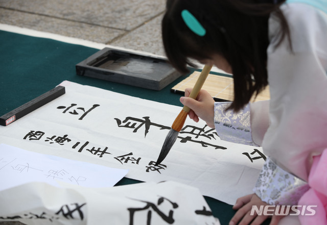 【서울=뉴시스】박미소 기자 = 5일 오전 서울 종로구 광화문 잔디광장에서 열린 '제18회 대한민국서당문화한마당 대회'에서 한 어린이가 휘호대회에서 '입신양명'을 쓰고 있다. 2019.05.05.