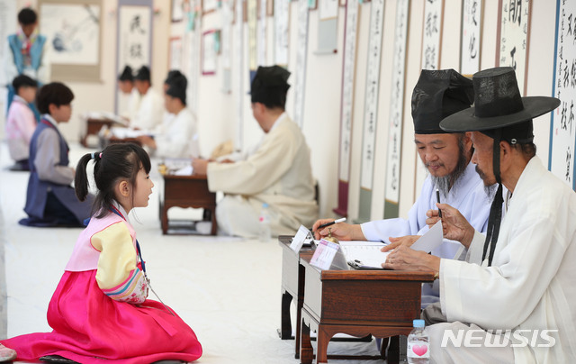 【서울=뉴시스】박미소 기자 = 어린이날인 5일 오전 서울 종로구 광화문 잔디광장에서 열린 '제18회 대한민국서당문화한마당 대회'에서 어린이들이 강경대회에 참여하고 있다.
