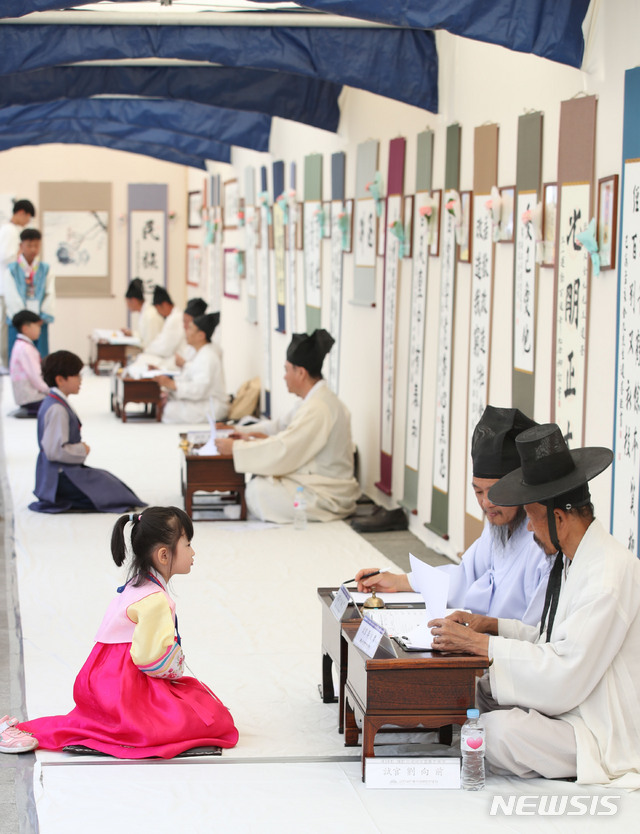 【서울=뉴시스】박미소 기자 = 어린이날인 5일 오전 서울 종로구 광화문 잔디광장에서 열린 '제18회 대한민국서당문화한마당 대회'에서 어린이들이 강경대회에 참여하고 있다.
