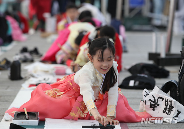 【서울=뉴시스】박미소 기자 = 5일 오전 서울 종로구 광화문 잔디광장에서 열린 '제18회 대한민국서당문화한마당 대회'에서 어린이들이 휘호대회에서 붓 글씨를 쓰고 있다. 2019.05.05.