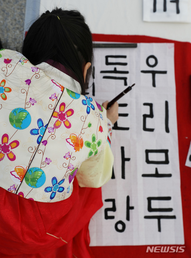 【서울=뉴시스】박미소 기자 = 5일 오전 서울 종로구 광화문 잔디광장에서 열린 '제18회 대한민국서당문화한마당 대회'에서 한 어린이가 휘호대회에서 붓 글씨를 쓰고 있다. 2019.05.05.