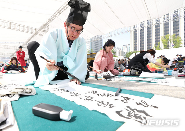 【서울=뉴시스】박미소 기자 = 5일 오전 서울 종로구 광화문 잔디광장에서 열린 '제18회 대한민국서당문화한마당 대회'에서 한 노인 참여자가 휘호대회에서 붓 글씨를 쓰고 있다. 2019.05.05.