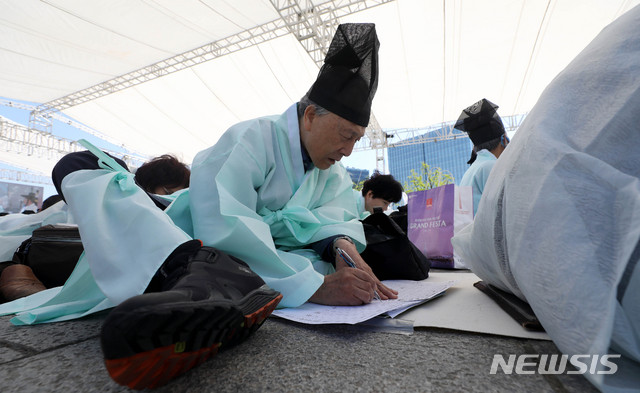 【서울=뉴시스】추상철 기자 = 제18회 대한민국 서당문화한마당이 열린 6일 오전 서울 종로구 광화문광장에서 한시대회 참가자들이 한시를 짓고 있다. 2019.05.06.