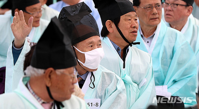 【서울=뉴시스】추상철 기자 = 제18회 대한민국 서당문화한마당이 열린 6일 오전 서울 종로구 광화문광장에서 마스크를 쓴 참가자가 한시대회에 참가해 준비를 하고 있다. 2019.05.06.