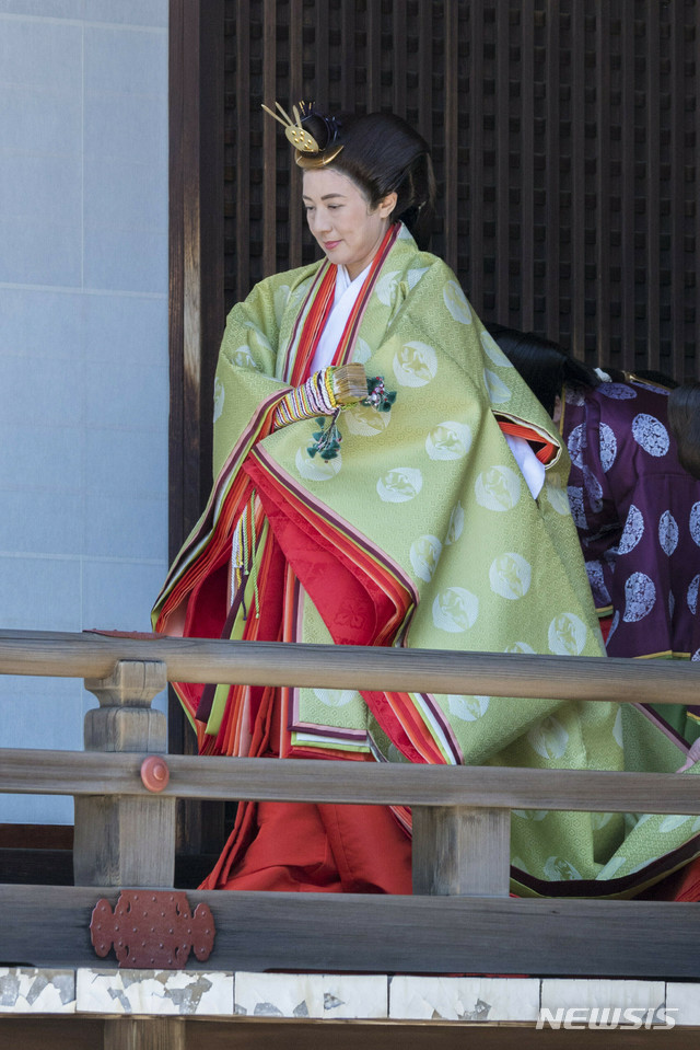 【도쿄=AP/뉴시스】일본 전통의상을 입은 마사코 日 왕비가 8일 나루히토 일왕의 즉위를 조상에 고하는 행사의 일환으로 일본 도쿄의 황궁 내 신전 '규추산덴'(宮中三殿)으로 참배하러 가고 있다. 2019.05.08.