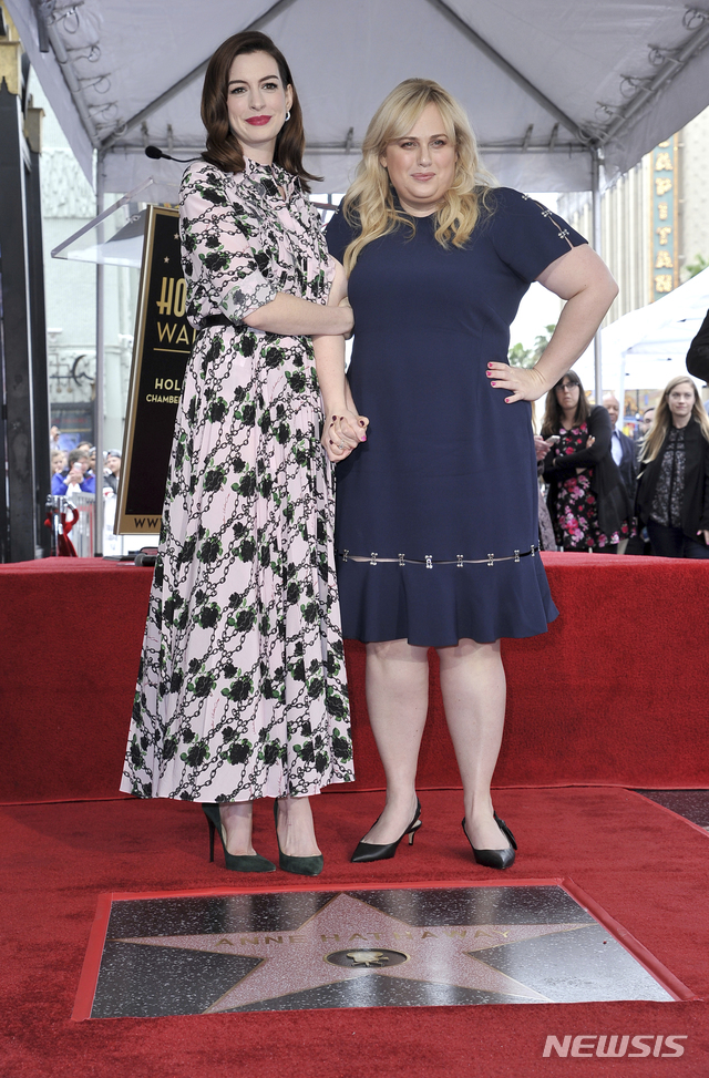 【로스앤젤레스=AP/뉴시스】배우 앤 해서웨이가 할리우드 명예의 거리에 입성, 9일(현지시간) 미 캘리포니아주 LA에서 열린 기념식에 참석해 배우 레벨 윌슨과 포즈를 취하고 있다.