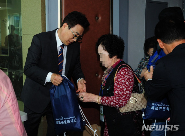 【서울=뉴시스】박미소 기자 = 박기원(왼쪽) 골프존 대표이사가 10일 오후 대전 충남대학교 정심화국제문화회관에서 골프존문화재단 주최로 열린 '사랑나눔효큰잔치'에서 어르신에게 생필품을 전달하고 있다. 2019.05.10. (사진=골프존뉴딘그룹 제공)