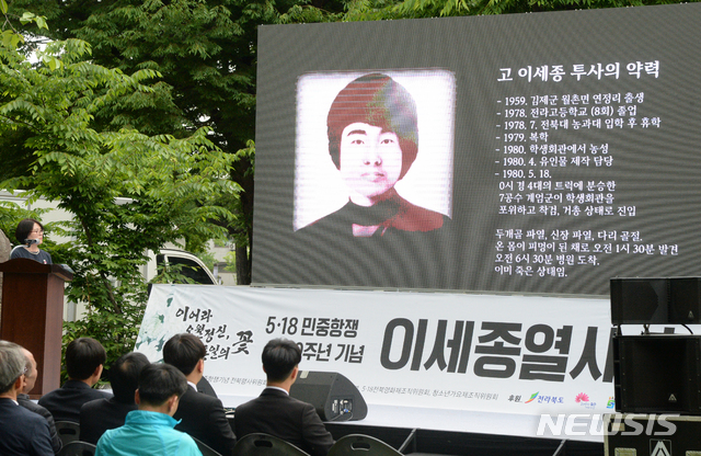 【전주=뉴시스】 김얼 기자= 5·18 민중항쟁 제39주년 이세종 열사 추모식이 17일 전북 전주시 전북대학교 이세종 열사 추모비 앞에서 실시된 가운데 대형 스크린에 이세종 열사의 약력이 나오고 있다. 2019.05.17.