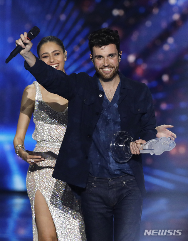 【텔아비브=AP/뉴시스】18일(현지시간) 이스라엘 텔아비브에서 막을 내린 2019 유로비전 송 콘테스트에서 '아케이드'라는 노래로 우승한 네덜란드의 덩컨 로렌스가 트로피를 들고 소감을 말하고 있다. 2019.05.19.