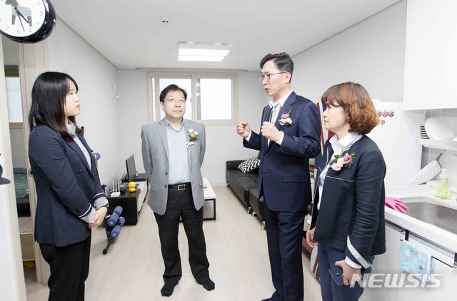 【서울=뉴시스】김선웅 기자 = 20일 서울 동작구 대방동 청년 1인가구 맞춤형 주택에서 이창우 동작구청장, 김세용 SH공사 사장이 입주 및 현판식을 마친 후 주택을 순회하고 있다. 2019.05.20. (사진=동작구 제공)