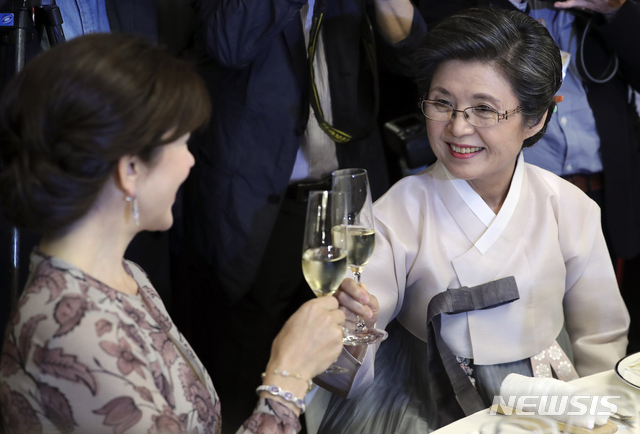 【서울=뉴시스】최진석 기자 = 이낙연 국무총리 부인인 김숙희 여사가 20일 서울 종로구 국무총리 서울공관에서 열린 덴마크 프레데릭 왕세자 내외 초청 만찬에서 덴마크 메리 왕세자비와 건배하고 있다. 2019.05.20.
