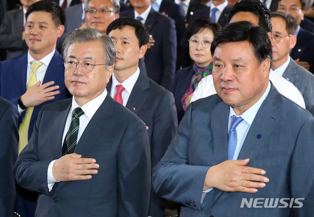 【청주=뉴시스】전신 기자 = 문재인 대통령이 22일 충북 청주 오송 CV센터에서 열린 '바이오헬스 국가비전 선포식'에 참석하여 서정진 셀트리온 회장과 함께 국민의례를 하고 있다. 2019.05.22.