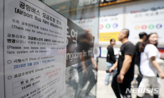 【서울=뉴시스】추상철 기자 =서울 공항버스 23개 노선 버스에 대해 교통카드요금이 1000원 인하됐다. 22일 오후 서울 중구 명동 공항버스정류장에는 공항버스 요금 조정 안내 문구가 게시돼 있다. 2019.05.22.