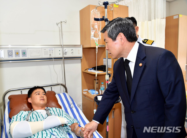 【창원=뉴시스】 강경국 기자 = 정경두 국방부 장관이 25일 경남 창원시 진해구 해군해양의료원을 방문해 청해부대 입항 사고로 입원한 장병을 위로하고 있다. 2019.05.25. (사진=해군 제공)