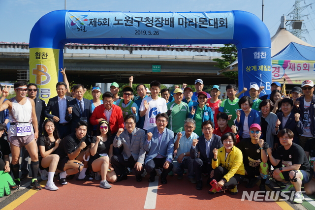 【서울=뉴시스】최진석 기자 = 오승록 노원구청장이 26일 오전 노원구 창동교 나눔의 광장에서 열린 제5회 노원구청장배 마라톤대회에 참석해 기념촬영하고 있다. 노원구 체육회가 주최하고 노원구 육상경기연맹이 주관한 이 날 대회에는 마라톤 동호인 등 800여명이 참석했다. 대회는 5km와 10km, 하프마라톤 등 3개 종목으로 나눠 진행됐다.  2019.05.26. (사진=노원구청 제공)