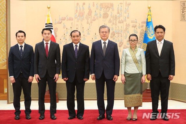 【서울=뉴시스】전신 기자 = 문재인 대통령이 31일 청와대 본관에서 열린 주한대사 신임장 제정식에서 티엥 부파 주한라오스대사로부터 신임장을 받고 기념촬영하고 있다. 2019.05.31.