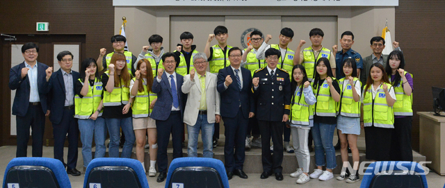 【대전=뉴시스】유순상 기자 = 대전 대덕대는 교내에서 경찰행정학과 학생 15명으로 구성, 교내외 순찰활동을 벌이는 '캠퍼스 폴리스(Campus Police)' 발대식을 개최했다고 3일 밝혔다. 김태봉(앞줄 오른쪽 일곱번째) 총장 등 참석자들이 기념촬영을 하고 있다. 2019.06.03.(사진=대덕대 제공)