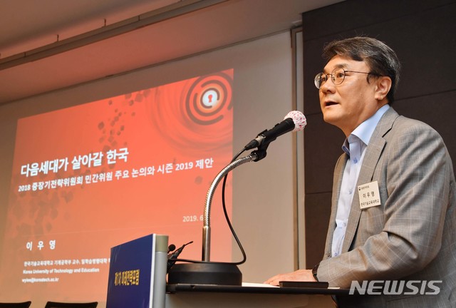 【서울=뉴시스】이우영 한국기술교육대 교수가 4일 서울 중구 대한상공회의소에서 열린 '제1차 미래전략포럼'에서 '다음세대가 살아갈 한국'을 주제로 발제를 하고 있다. 2019.06.04. (사진=기획재정부 제공)