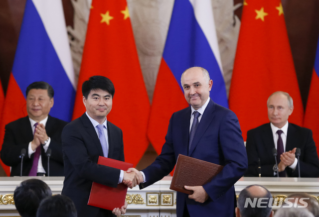 【모스크바=AP/뉴시스】궈핑 화웨이 순환회장(앞줄 왼쪽)과 알렉세이 코르냐 러시아 MTS통신사 최고경영자가 5일(현지시간) 러시아 모스크바에서 5G 통신망 구축에 관한 계약을 맺은 후 악수하고 있다. 그 모습은 시진핑 중국 국가주석과 블라디미르 푸틴 러시아 대통령이 바라보며 박수치고 있다. 2019.06.06