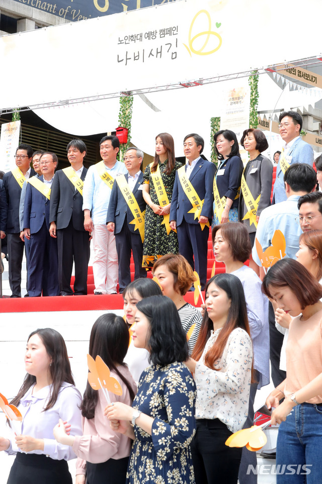【서울=뉴시스】배훈식 기자 = 8일 오전 서울 종로구 세종문화회관에서 열린 노인학대 예방 캠페인 나비새김 제막식에서 홍보대사 배우 이시영 등 참석자들이 기념촬영을 하고 있다. 2019.06.08.