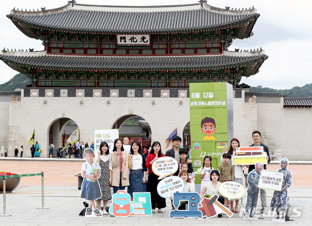 【서울=뉴시스】김병문 기자 = '세계 아동노동반대의 날'을 이틀 앞둔 10일 오전 서울 종로구 광화문광장에서 굿네이버스 관계자들이 시민들과 아동노동 근절 캠페인을 마치며 기념촬영하고 있다. 2019.06.10.