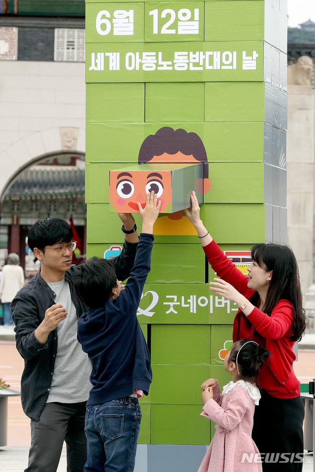 【서울=뉴시스】김병문 기자 = '세계 아동노동반대의 날'을 이틀 앞둔 10일 오전 서울 종로구 광화문광장에서 굿네이버스 관계자들이 시민들과 아동노동 근절 캠페인을 하고 있다. 2019.06.10.
