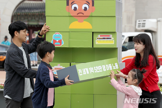 【서울=뉴시스】김병문 기자 = '세계 아동노동반대의 날'을 이틀 앞둔 10일 오전 서울 종로구 광화문광장에서 굿네이버스 관계자들이 시민들과 아동노동 근절 캠페인을 하고 있다. 2019.06.10.