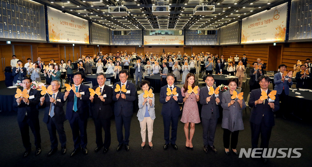 【서울=뉴시스】김병문 기자 = 박능후(앞줄 왼쪽 일곱번째) 보건복지부 장관이 14일 오전 서울 중구 대한서울상공회의소 국제회의장에서 열린 '제3회 노인학대 예방의 날' 기념행사에 참석해 나비새김 퍼포먼스를 하고 있다. 2019.06.14.
