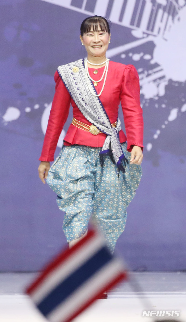 【서울=뉴시스】박미소 기자 = 15일 오후 서울 중구 서울시청광장에서 열린 '2019 아세안 위크 아세안 패션 축제'에서 주한태국대사의 부인인 펀디 랍피쎗판이 런웨이에서 워킹하고 있다. 2019.06.15.