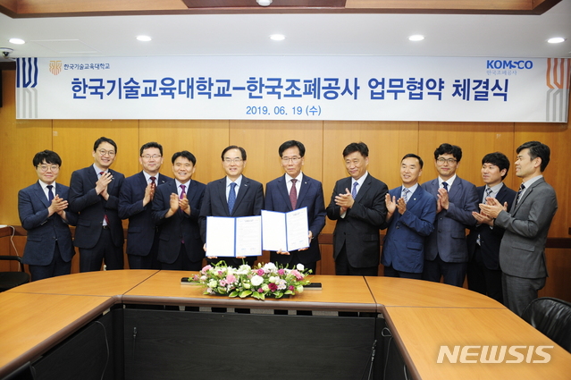 【천안=뉴시스】이종익 기자 = 충남 천안이 코리아텍(총장 이성기)는 19일 오후 교내에서 한국조폐공사(사장 조용만)와 4차산업 평생직업능력개발과 교육훈련 개발 등을 위한 협약을 체결했다. 2019.06.20. (사진=코리아텍 제공)