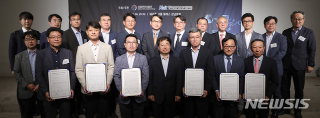 【서울=뉴시스】김선웅 기자 = 20일 오후 서울 서초구 쉐라톤 서울팔래스 강남 호텔에서 한국산업기술평가관리원(KEIT)이 주관한 차세대 반도체 기술개발 총괄워크숍, 반도체산업 경쟁력 강화를 위한 대토론회 시작에 앞서 정양호(앞줄 오른쪽 세번째) KEIT 원장과 R&D 수행기관 대표들이 차세대반도체 R&D 과제 협약식을 진행하고 있다. 2019.06.20.