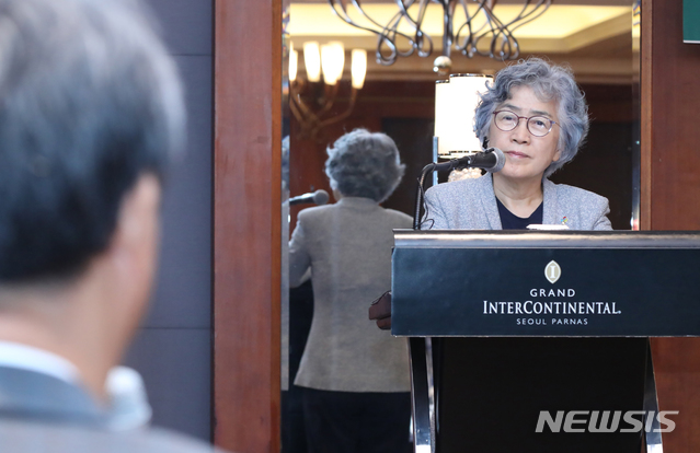 【서울=뉴시스】박은정 국민권익위원장이 21일 서울 강남구 그랜드인터컨티넨탈 파르나스 호텔에서 한국법제연구원 주최로 열린 제36회 입법정책포럼에서 참석자로부터 "일부 공공기관의 재정 낭비에 대한 권익위의 감시·견제 기능 역할"에 대해 질의를 듣고 있다. 2019.06.21. (사진=국민권익위원회 제공)