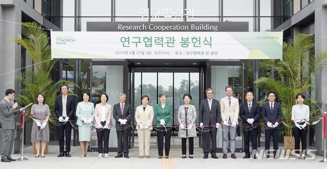 【서울=뉴시스】21일 서울 서대문구 이화여자대학교 연구협력관 앞 광장에서 연구협력관 봉헌식이 열린 가운데 참석자들이 테이프 커팅을 하고 있다.