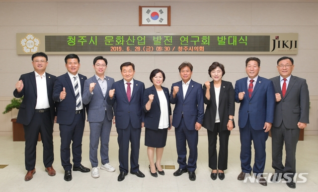 【청주=뉴시스】강신욱 기자 = 28일 충북 청주시의회 특별위원회 회의실에서 청주시문화산업발전연구회가 발대식을 하고 본격적인 활동에 들어갔다. 이 연구회는 김미자 의원 등 청주시의원 9명으로 구성했다. 2019.06.28. (사진=청주시의회 제공)
