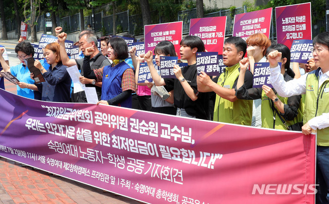 【서울=뉴시스】배훈식 기자 = 2일 오전 서울 용산구 숙명여자대학교 앞에서 숙대 총학생회와 공공운수노조 서울지부 등 노동자들이 공동 기자회견을 열고 최저임금위원회 공익위원 권순원 교수가 최저임금 1만원 실현을 위해 노력해 줄 것을 촉구하고 있다. 2019.07.02.