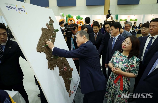 한반도 지도에 씨앗 붙이는 문재인 대통령