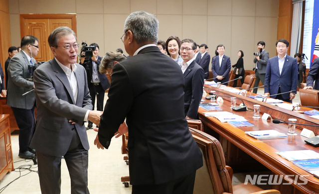 【서울=뉴시스】전신 기자 = 문재인 대통령이 9일 청와대 본관에서 열린 공정경제 성과 보고회의에 입장하며 최창희 공영 홈쇼핑 사장과 인사하고 있다. 2019.07.09.