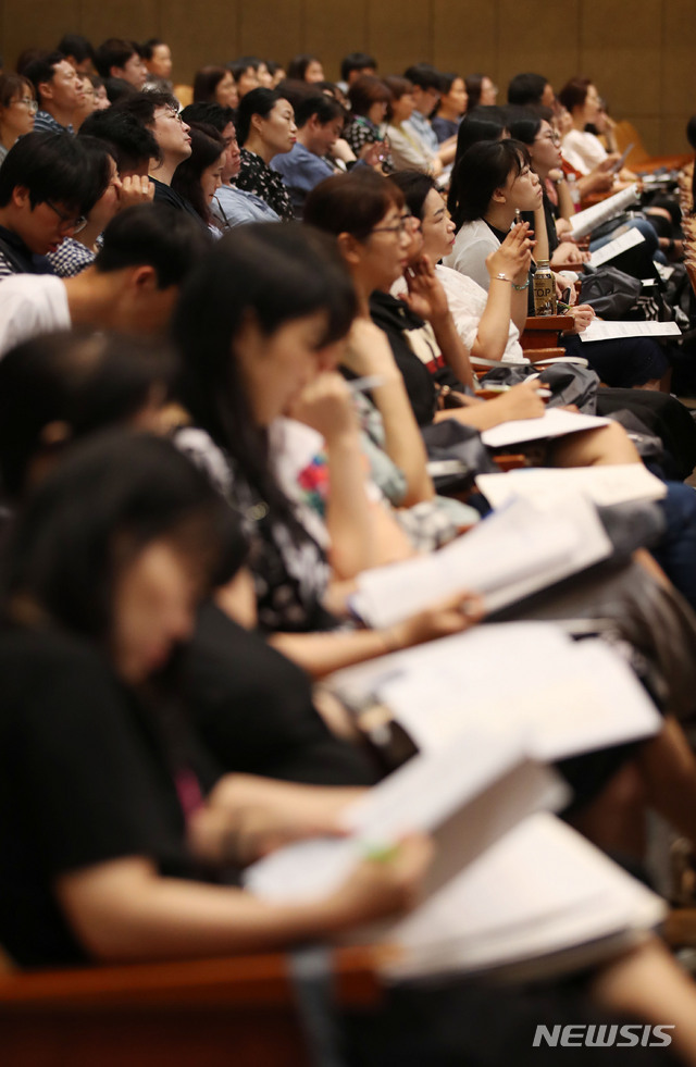【서울=뉴시스】김진아 기자 = 14일 오후 삼육대학교 대강당에서 열린 '2020학년도 전국 적성고사대학 연합 입시설명회'에서 적성고사 전형에 관심 있는 수험생과 학부모, 고교 교사 등 참석자들이 강사의 설명을 듣고 있다. 2019.07.14.