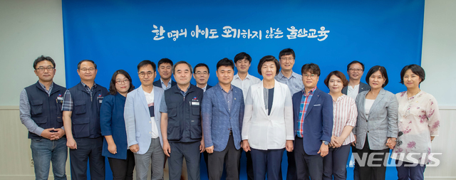 【울산=뉴시스】 박수지 기자 = 노옥희(앞줄 왼쪽 일곱번째) 울산시교육감과 일반직노조 교육연맹, 한국노총 울산지부 임원진이 17일 울산광역시교육청 접견실에서 면담을 가진 후 기념촬영을 하고 있다. 2019.07.17. (사진=울산광역시교육청 제공)