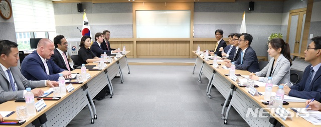 【대전=뉴시스】 김양수 기자 = 박원주 특허청장이 18일 특허청 서울사무소에서 비샬 아민(Vishal Amin) 미국 지식재산집행 조정관과 주요 인사들을 만나 한-미 양국의 지재권 보호 및 집행에 관해 논의하고 있다.2019.07.18(사진=특허청 제공)