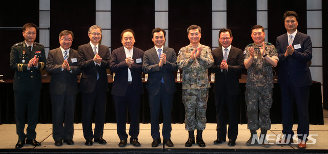 【서울=뉴시스】김선웅 기자 = 29일 서울 중구 웨스틴조선호텔에서 서울대학교 국제문제연구소가 주최하고 육군본부가 후원하는 '4차 산업혁명과 미래전, 그리고 세계정치' 컨퍼런스에서 안규백(왼쪽 다섯번째부터) 국회 국방위원장과 서욱 육군참모총장 등 참석자들이 기념촬영을 하고 있다. 2019.07.29.
