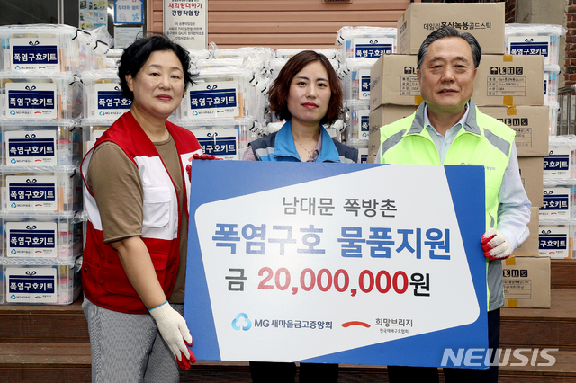 【서울=뉴시스】김병문 기자 = 박차훈 새마을금고중앙회장이 30일 오후 서울 중구 남대문쪽방촌을 찾아 주민들에게 폭염 구호키트를 전달하기에 앞서 기부금 전달식을 하고 있다.