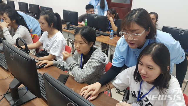 【천안=뉴시스】이종익 기자 = 충남 천안의 코리아텍(총장 이성기) 학생들이 31일 라오스 루앙프라방의 뻥캄중고등학교(PONG KHAM Secondary school)에서 현지 학생을 대상으로 동영상·웹사이트 제작 등 'IT교육봉사'를 진행하고 있다. 2019.08.01. (사진=코리아텍 제공)