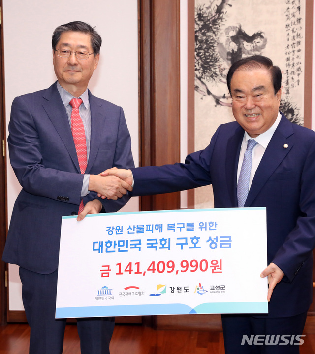 【서울=뉴시스】 박영태 기자 = 5일 오후 서울 여의도 국회에서 열린 강원 산불피해 복구를 위한 대한민국 국회 구호성금 전달식에서 문희상(오른쪽) 국회의장이 송필호 전국재해구호협회장에게 성금을 전달한 후 악수를 하고 있다. 2019.08.05.
