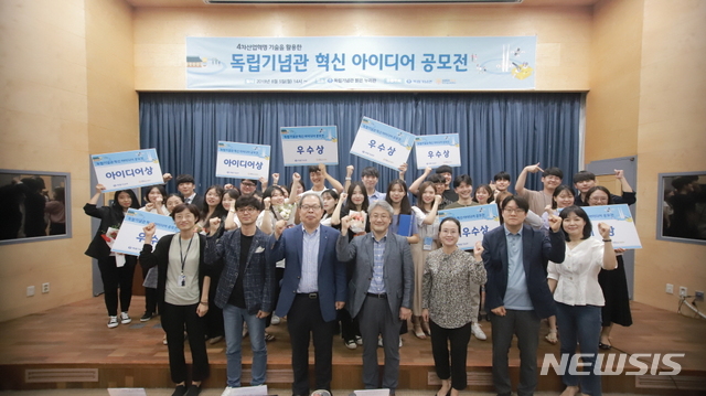 【천안=뉴시스】이종익 기자 = 충남 천안의 코리아텍(총장 이성기)과 독립기념관(관장 이준식)은 5일 오후 독립기념관에서 공동 주최한 '독립기념관 혁신 아이디어 공모전' 본선 대회를 개최했다. 수상팀들이 함께 기념촬영을 하고 있다. 2019.08.06. (사진=코리아텍 제공)